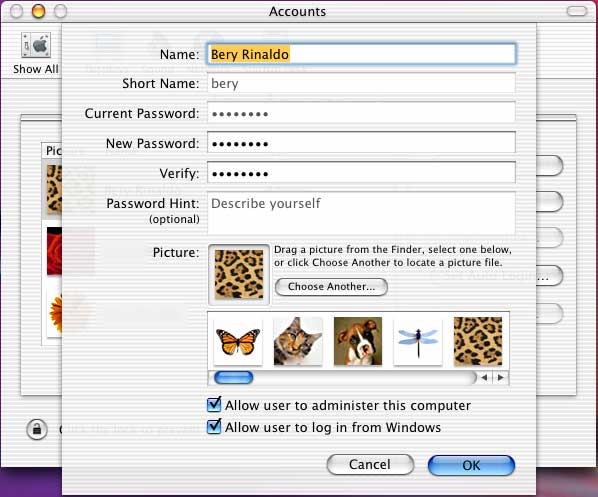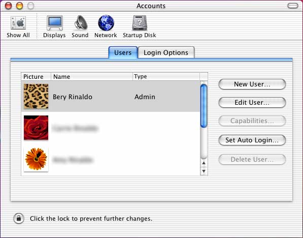 Click on the Show All button in the upper left of the System Preferences. Then click on the Accounts button. The following panel will be seen: