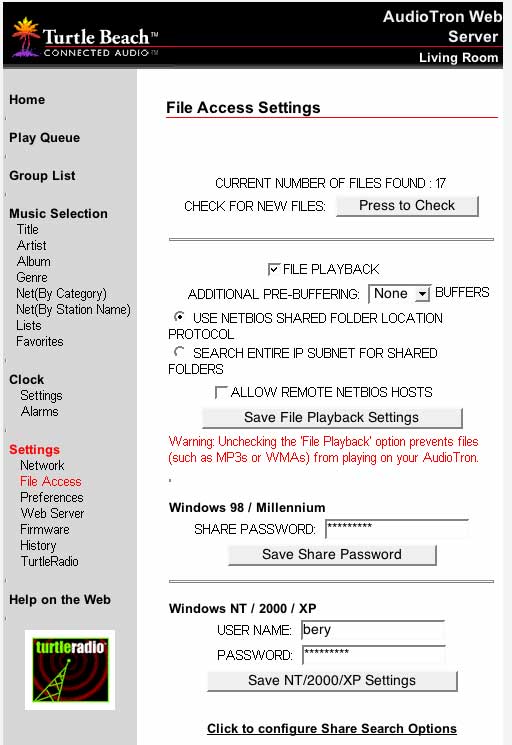 Open up your web browser to the AudioTron's web interface. Go to File Access from the Settings section on the lower left side of the page. You will need to enter your AudioTron's administrator username and password (default admin:admin) to access this page. Enter your short Mac username and password in the Windows NT/2000/XP section at the bottom of the page and click on the Save NT/2000/XP Settings button.