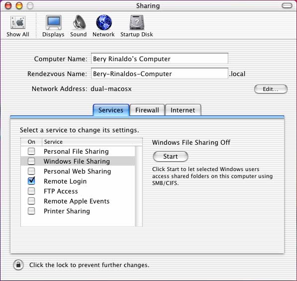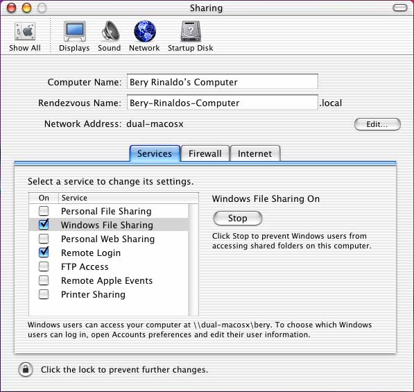 Click on the Windows File Sharing line and either click the checkbox to the left, or click the Start button on the right. When complete, the checkbox will remain checked as shown below: